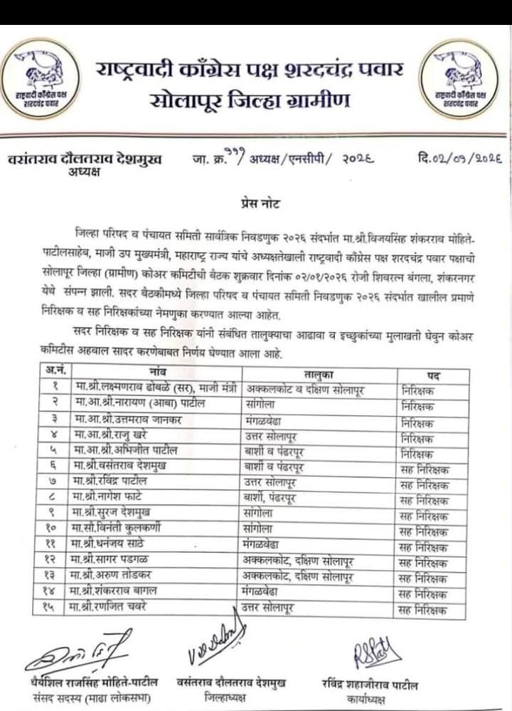 संपूर्ण राज्यामध्ये जिल्हा परिषद आणि पंचायत समितीचे वारे वाहू लागले आहेत. अशाच सोलापूर जिल्ह्यातील राष्ट्रवादी काँग्रेस शरदचंद्र पवार पक्षाच्यावतीने जिल्हा परिषदे आणि पंचायत समितीवर झेंडा फडकवण्याच्या दृष्टीने जोरदार हालचाली सुरू केले आहेत. सुरुवातीचा पहिला टप्पा म्हणून जिल्ह्यातील प्रत्येक तालुक्यामध्ये निरीक्षकांसह सहनिरीक्षकांच्या नियुक्ती करण्यात आल्या आहेत.