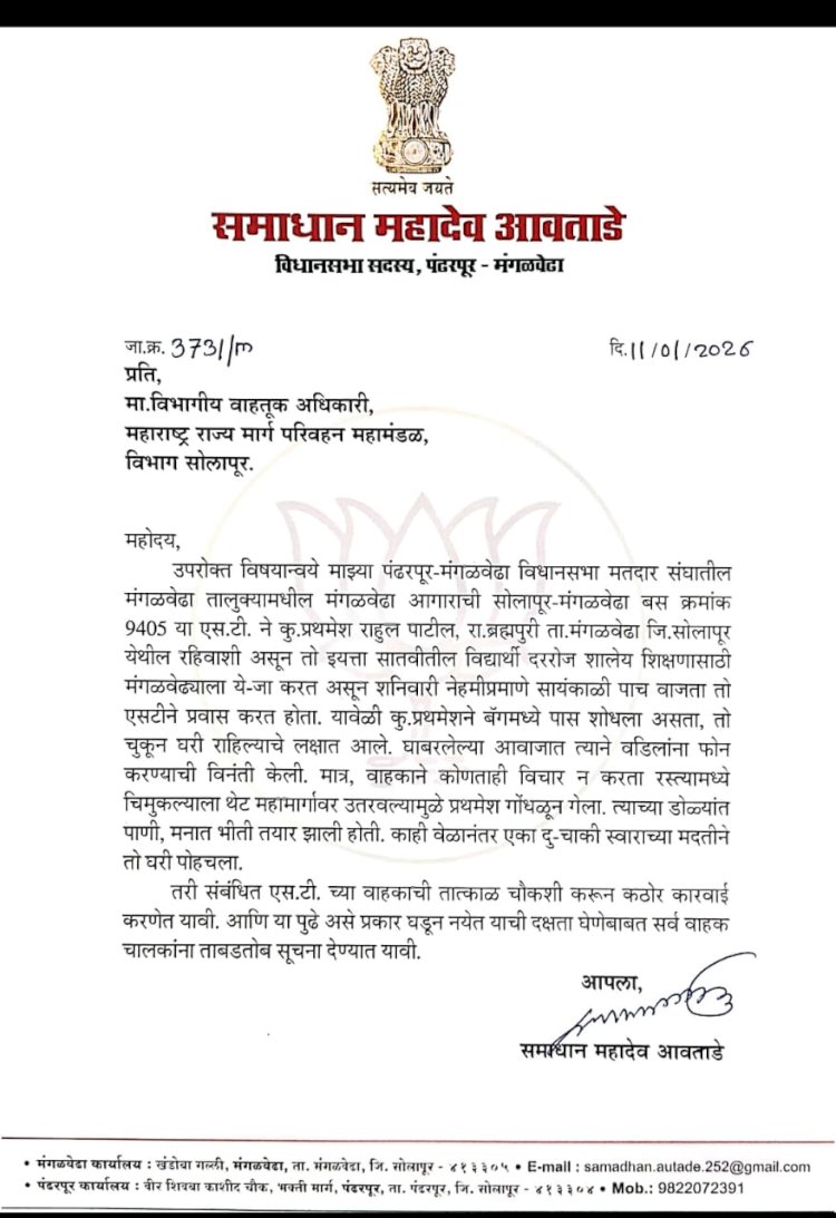 जात आहेत. विविध प्रकारच्या लोकांना विविध प्रकारच्या सवलती दिल्या जात आहेत. त्यामुळे राज्य परिवहन महामंडळाच्या बाबतीत गोरगरीब जनता समाधानी होती. मात्र मंगळवेढा आगारातील एका वाहकाने शाळेत जाणाऱ्या चिमुकल्यावर आपली शिस्त दाखवण्याचा प्रयत्न केला. ती शिस्त नसून माणुसकीच्या बाहेरचं जगणं असेच सिद्ध झालं आहे. त्यामुळे त्या वाहका विरोधात सामान्य नागरीकातून उद्रेक व्यक्त केला जात आहे. अशातच पंढरपूर मंगळवेढा विधानसभा मतदारसंघाचे आमदार समाधान आवताडे यांनीही, या घडलेल्या प्रकाराबाबत तीव्र नाराजी व्यक्त करीत, त्या वाघाच्या विरोधात चौकशी करून कारवाई करावी असा लेखी आदेश , राज्य परिवहन महामंडळाचे विभागीय वाहतूक अधिकारी यांना दिला आहे.