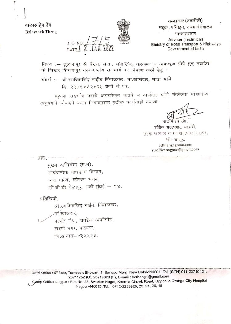 : देशाचे लोकप्रिय पंतप्रधान नरेंद्र मोदी केंद्रीय गृहमंत्री अमित शहा भारतीय जनता पार्टी चे अध्यक्ष जेपी नड्डा सडक परिवहन मंत्रालय नितीन गडकरी यांच्या मार्गदर्शनाखाली लोकसभा मतदारसंघाचे लोकप्रिय खासदार रणजितसिंह नाईक निंबाळकर यांनी सडक परिवहन राज्यमार्ग मंत्रालय यांच्याकडे वारंवार पणे पाठपुरावा करून तसेच या मंत्रालयाकडे दिनांक 22/१०/२०२१ रोजी नियोजित तुळजापूर ते वैराग-माढा-मोडनिंब-करकंब मार्गे-अकलूज शिखर शिंगणापूर पर्यंत राष्ट्रीय राज्यमार्ग रस्ता करण्याबाबतचे लेखी पत्र दिले होते, त्या पत्राच्या अनुसार सडक परिवहन राज्य मंत्रालय यांनी या नियोजित राष्ट्रीय राज्यमार्ग याबाबत कार्यवाही करण्याचे निर्देश दिले असल्यामुळे आता तुळजापूर ते करकंब मार्ग शिखर शिंगणापूर हा मार्ग लोकांसाठी सामान्यांसाठी,भाविकांसाठी होणार आहे