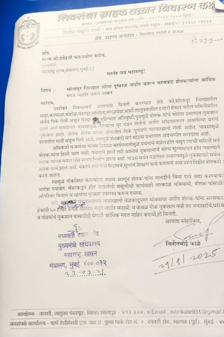 सोलापूर जिल्ह्यात ओला दुष्काळ जाहीर करून सरसकट शेतकऱ्यांना आर्थिक मदत जाहीर करावी. सोलापूर जिल्ह्यातील माढा ,करमाळा, मोहोळ, पंढरपूर , उत्तर सोलापूर, मंगळवेढा, बार्शी तालुक्यातील हजारो हेक्टर वरील जमिनीवरील सर्वच पिके वाहून गेली गेली आहेत. अतिवृष्टी पुरामुळे शेतकऱ्यांचे मोठ्या प्रमाणात नुकसान झाले आहे .मुसळधार पावसामुळे नाल्याला पुर येऊन शेतीचे आणि ओढ्यालगत असलेल्या घरांचे नुकसान झाले आहे .अनेक शेतकऱ्यांच्या शेतातील पिके पूर्णपणे पाण्याखाली गेली आहेत .पावसामुळे शेतातील माती वाहून गेली आहे. त्यामुळे शेतकरी वर्ग मोठ्या प्रमाणात अडचणीत सापडला आहे .